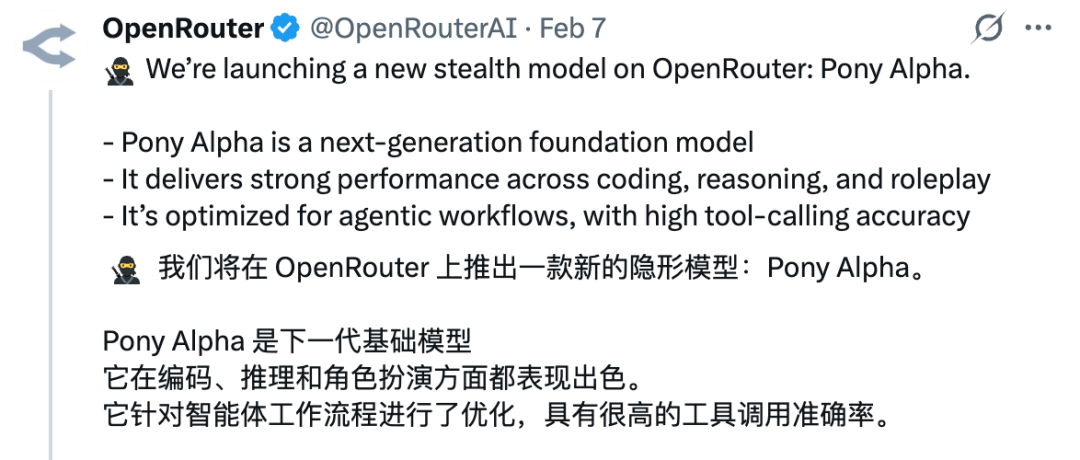 从公开资料来看,Pony Alpha 是 OpenRouter 于 2 月 6 日上线的一款“隐身模型”(stealth model),目前完全免费,并可通过 OpenRouter 调用。