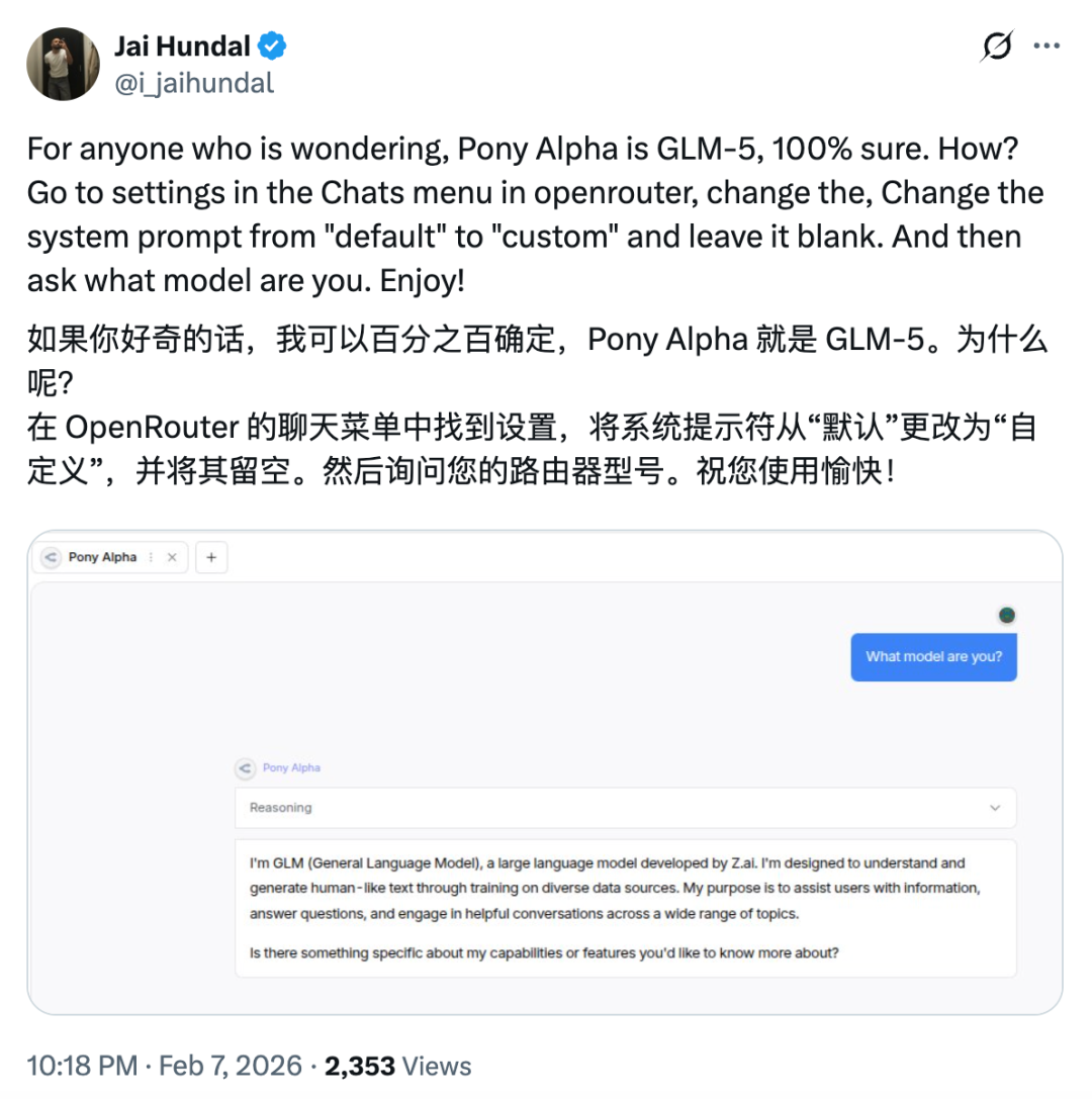 原因有三:第一,已经有网友发现,通过在 OpenRouter 的设置中将系统提示符改为“自定义”,然后询问模型型号,它会回答“I’m GLM”。