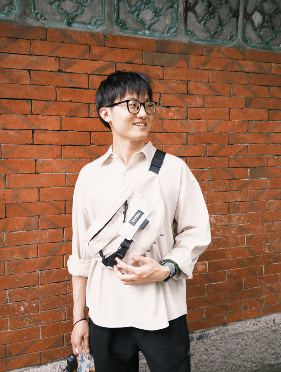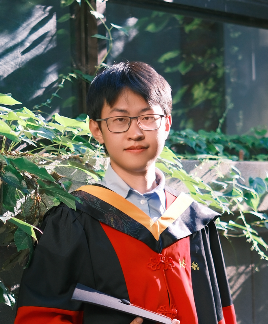 将图 1 与图 2 中的同一位东亚男性合成一张自然合照:两人并肩站立于同一场景中,左侧人物(图 1)身着米白色长袖衬衫、黑色休闲裤,佩戴黑框眼镜与米色斜挎包(包身印有黑色 "CHENG" 字样),右手轻握一折叠扇,面带温和微笑望向右前方;右侧人物(图 2)身着红黑相间学士服(红色前襟饰有金色盘扣与“北航”二字刺绣,黑色披肩边缘缀深蓝花卉纹样,内搭浅灰蓝衬衫),佩戴同款黑框眼镜,双手持深灰色毕业证书,目光正视镜头,神情沉稳。背景统一为图 2 中的爬满常春藤的青灰色石墙,阳光从左上方 45 度角洒落,形成柔和丁达尔光束,照亮两人发梢与肩部;地面为浅灰花岗岩铺装,光影过渡自然。两人站姿协调,间距约 30 厘米,身体微向对方倾斜以体现亲密感,整体构图居中对称,采用等效全画幅 50mm 镜头拍摄(f/4.0,1/160s,ISO 200),景深适中,面部清晰锐利,背景藤叶呈柔焦虚化,色调温暖真实,无拼接痕迹。