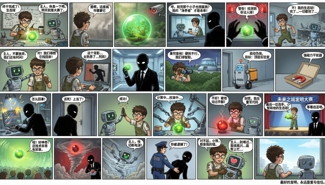 一个 4x6 格漫画,一共 4 行,每行 6 格。每一格之间有白色的分割线。第一排,从左到右依次为第一格:一个凌乱的实验室中。戴眼镜、穿油污工装背带裤的男孩 (小智) 专注焊接发光的绿色球体。墙上贴满草图和公式。对话框显示“终于完成了!生态球”。可爱机器人用机械臂递上咖啡,头顶显示器是笑脸。“主人,休息一下吧。明天就是大赛了”第二格:戴眼镜、穿油污工装背带裤的男孩看向窗外,城市笼罩在灰色雾霾中。“是啊,这座城市需要它”第三格:绿色小球的特写镜头,内部微小植物生长,发出柔和绿光。在远处,实验室角落监控的摄像头红灯闪烁。第四格:一个冰冷的高科技实验室中。穿黑西装的面具男站在屏幕前,屏幕画面是一个机器人给戴眼镜、穿油污工装背带裤的男孩递咖啡。“哼,就凭那个小子也想赢我?我的‘净界者’才是未来!”第五格:黑色的双手伸向工作台上发光的绿色球体。警报器红光闪烁。对话框内容:“警告!检测到非法入侵!”第六格:戴眼镜、穿油污工装背带裤的男孩冲进实验室,实验室的支架空荡荡,一片狼藉。机器人在一旁,屏幕是担忧哭脸。男孩说:“不!我的生态球!完了... 一切都完了...”第二排,从左到右依次为第一格:机器人拍拍戴眼镜、穿油污工装背带裤的男孩肩膀,屏幕切换成坚定表情“主人,不要放弃。我们还有时间!”。戴眼镜、穿油污工装背带裤的男孩眼中重新燃起斗志,紧握拳头。“对!我们得把它找回来!”第二格:男孩在电脑前分析监控录像,定格在黑影翻墙瞬间。“这个背影... 太熟悉了... 阿凯!”第三格:穿黑西装的面具男在高科技实验室内把玩绿色小球。第四格:一个男孩和一个机器人躲在草丛后,拿着望远镜,对着远处灯火通明的实验室看。男孩说:“果然是他!硬抢不行,我们得智取。”第五格:一个外卖机器人站在门前,提着餐盒:“启动伪装。目标:顶层实验室”。第六格:一个实验室桌子上有一个打开的餐盒,里面是一个磁铁,文字气泡内容:“强磁力干扰器”。第三排,从左到右依次为第一格:实验室灯光闪着火花,电脑屏幕故障。穿着黑西装的面具男在修理电脑,说着:“怎么回事!”。第二格:穿着黑西装的面具男回头,只看到开着的门。“该死!上当了!”第三格:机器人与戴眼镜、穿油污工装背带裤的男孩汇合,两人击掌。“成功!”第四格:回到实验室,戴眼镜、穿油污工装背带裤的男孩在工作台上修理小球。多条机械臂高速工作,出现残影。“计算中... 校准中...”第五格:桌上的小球发出红光并冒烟,戴眼镜、穿油污工装背带裤的男孩额头冒汗,说着:“不好!被他动过手脚!”。旁边有一个机器人:“别慌,我在重写代码”第六格:舞台上有一个横幅上面写着“未来之城发明大赛”,戴眼镜、穿油污工装背带裤的男孩抱着发光的绿色小球站在舞台上,文字气泡“最后一位选手,小智和他的生态球!”。穿黑色西装的面具男在台下:“等着出丑吧。”第四排,从左到右依次为第一格:绿色小球释放绿色能量波纹。舞台下面有许多观众:“哇!好神奇!这技术非常有前景。”第二格:小球突然变成红色,卷起龙卷风。穿黑色西装的面具男藏在后台,手中握着遥控器,上面有一个红色按钮。第三格:机器人被卷入龙卷风中,对话框:“主人,快切断电源!”。第四格:穿着制服的警察把黑西服面具男按在地上,文字气泡内容:“你被逮捕了!”第五格:男孩抱着受损的机器人,“对不起,小铁,都是我的错”。机器人屏幕亮起虚弱笑脸:“主人... 别难过... 我很高兴... 能帮上忙...”第六格:男孩和机器人肩并肩站在窗边,望着晴朗干净的城市。小铁屏幕上是一个大大的爱心。右下角写着:“最好的发明,永远是爱与信任。”