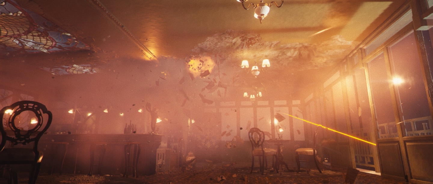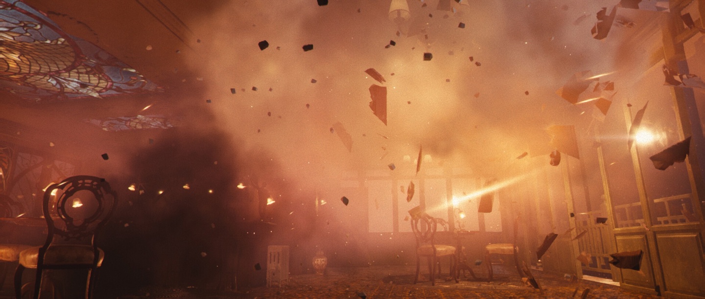 在战斗片段中,黑豹从露台闯入酒店休息室,与多名士兵交战。画面中可见环境高度可交互,士兵射击时击碎酒瓶,黑豹跃击敌人时撞翻家具。动作设计强调敏捷与跑酷元素,包括远程攻击、闪避翻滚以及流畅的跨越障碍物,展现了高速、立体的战斗节奏。