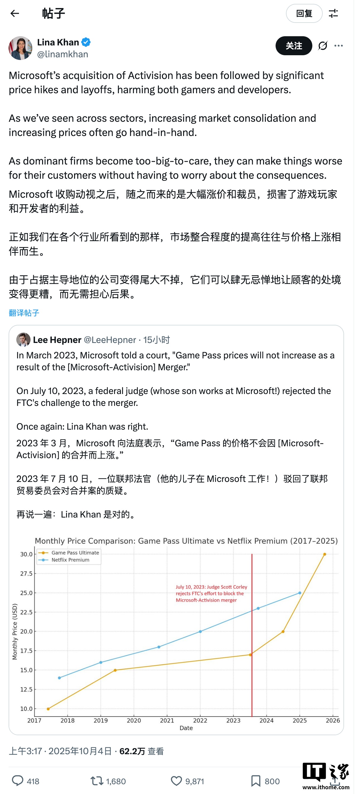 这一帖子回应了一条“再说一遍,莉娜・汗是对的”的评论,评论涉及微软此前承诺 Game Pass 订阅费用不会因合并而上涨的说法。