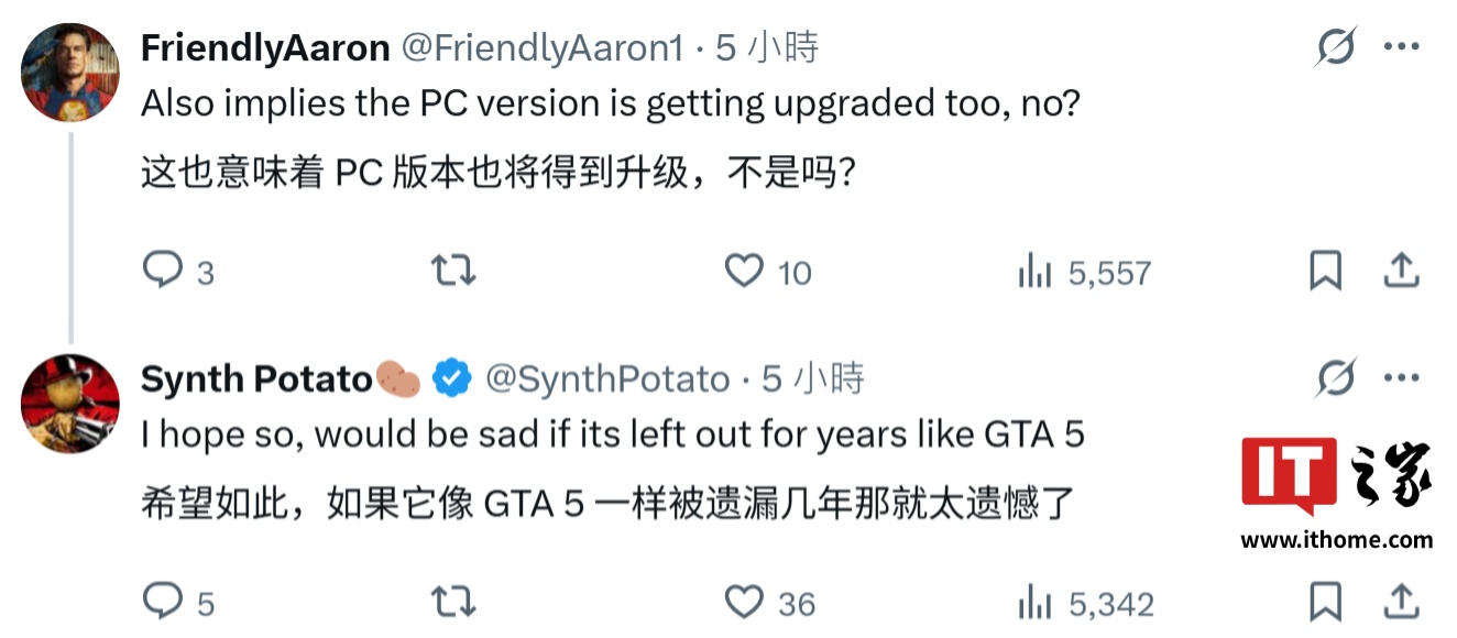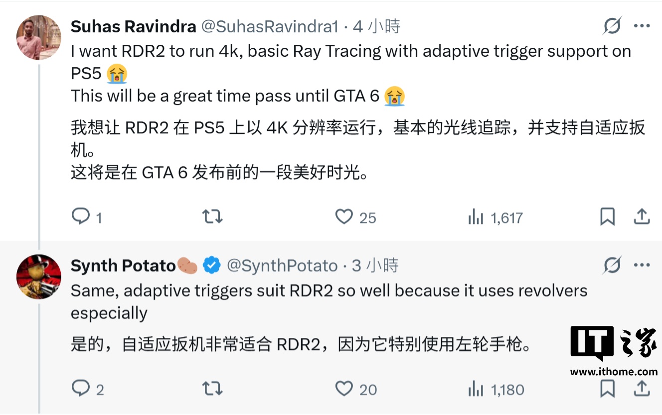 后续有玩家在评论区询问消息人士“PC 版本会不会升级”,Synth 则回复道:“我希望如此,但我还是担心它像《GTA5》那样延迟好几年”;他还认为 PS5 主机 DualSense 手柄的“自适应扳机”功能非常适合《荒野大镖客 2》,毕竟游戏里全都是左轮手枪,更细腻的手感可以给玩家真实感受。