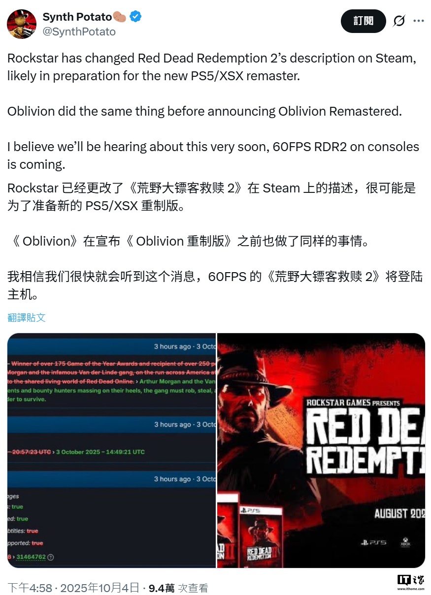 本次更改发生于 10 月 3 日,Synth Potato 认为这代表着 R 星已经准备好《荒野大镖客:救赎 2》游戏的 PS5 / XSX 平台重制版,因为 B 社在官宣推出《上古卷轴 4:湮灭重制版》之前也修改了原版《上古卷轴 4:湮灭》的 Steam 商品描述页面。