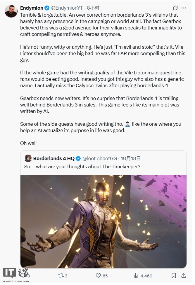 用户 @EndymionYT 更是借此机会批评了游戏的整体剧情,认为其“糟糕且令人遗忘”,与《无主之地 3》相比,反派角色在整个游戏世界中几乎没有存在感。他指出,Gearbox 似乎已经失去了创造引人入胜剧情与角色的能力,该反派角色既不搞笑也不机智,只是一个“邪恶且冷漠”的角色。相比之下,“卑鄙执政官”(Vile Lictor)主线任务的剧情设计则更为出色,令人印象深刻。如果游戏整体写作水平能与之相当,玩家的体验将大不相同。此外,该用户还提到,尽管一些支线任务的写作较为出色,例如帮助 AI 寻找生命意义的任务,但主线剧情却显得乏善可陈,甚至感觉“像是 AI 写的”。