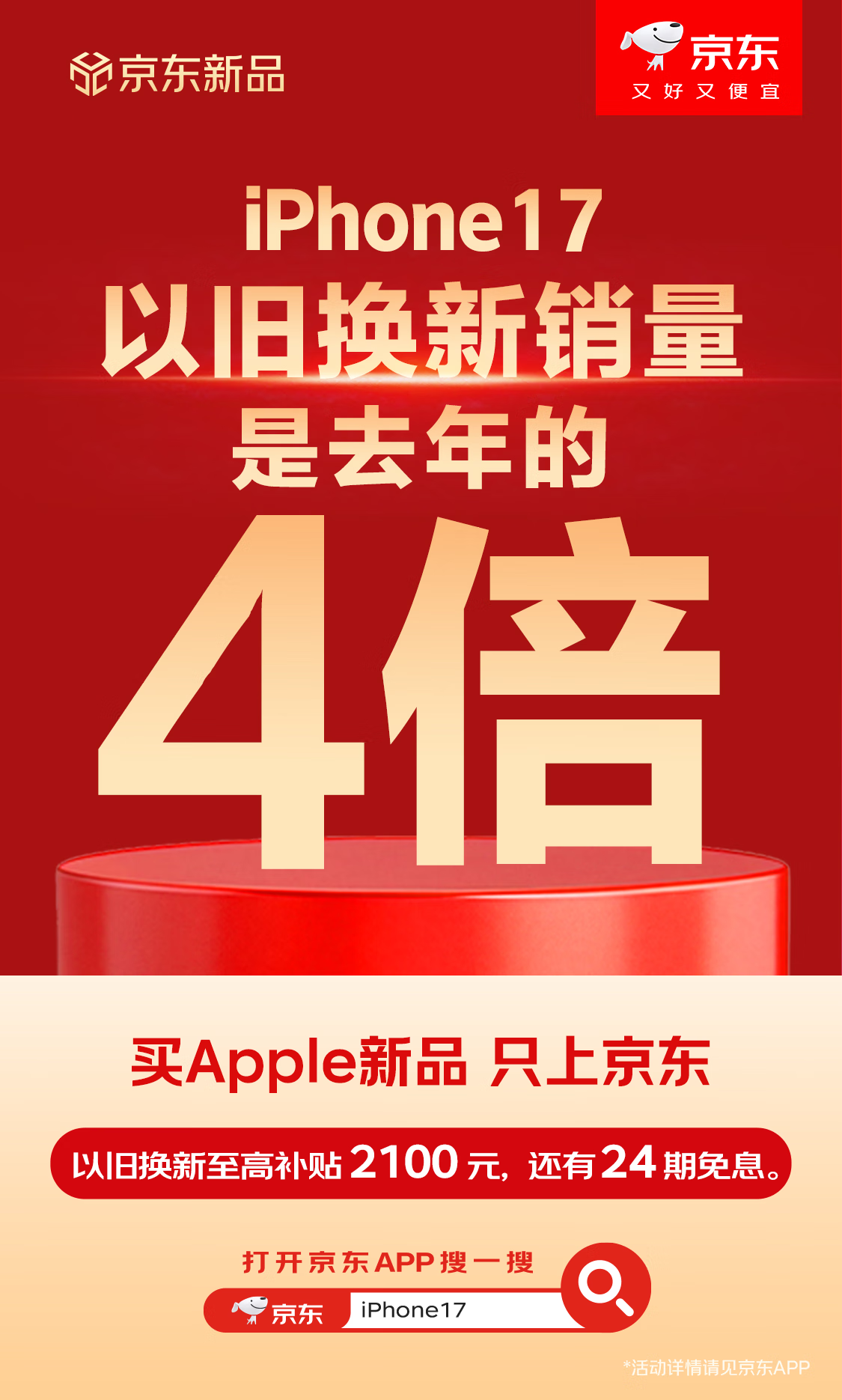 为保障用户更快拿到新机,京东提前全面备货,在发售开始前把充足的货源调动到全国各地的仓库中,并且联动全国近万家 Apple 授权门店同步发售。京东数据显示,iPhone 17 系列新品在京东预售开启 1 分钟,成交量即超去年全天,刷新销售纪录。截至 9 月 19 日 10 点,iPhone 17 以旧换新销量是去年同期 4 倍。