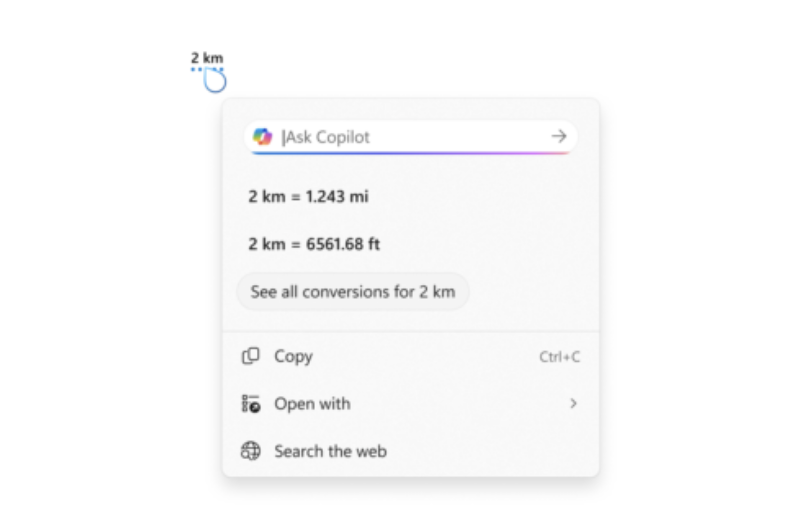 微软为 Click to Do 新增单位换算功能,用户输入数字 + 单位组合时可以直接看到单位换算结果,支持长度、面积、体积、重量、温度、速度。