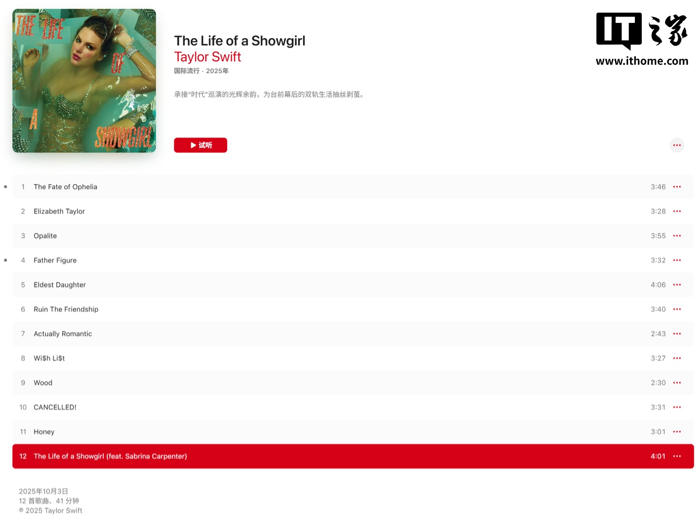 标签:The Life of a Showgirl Taylor Swift iTunes 苹果