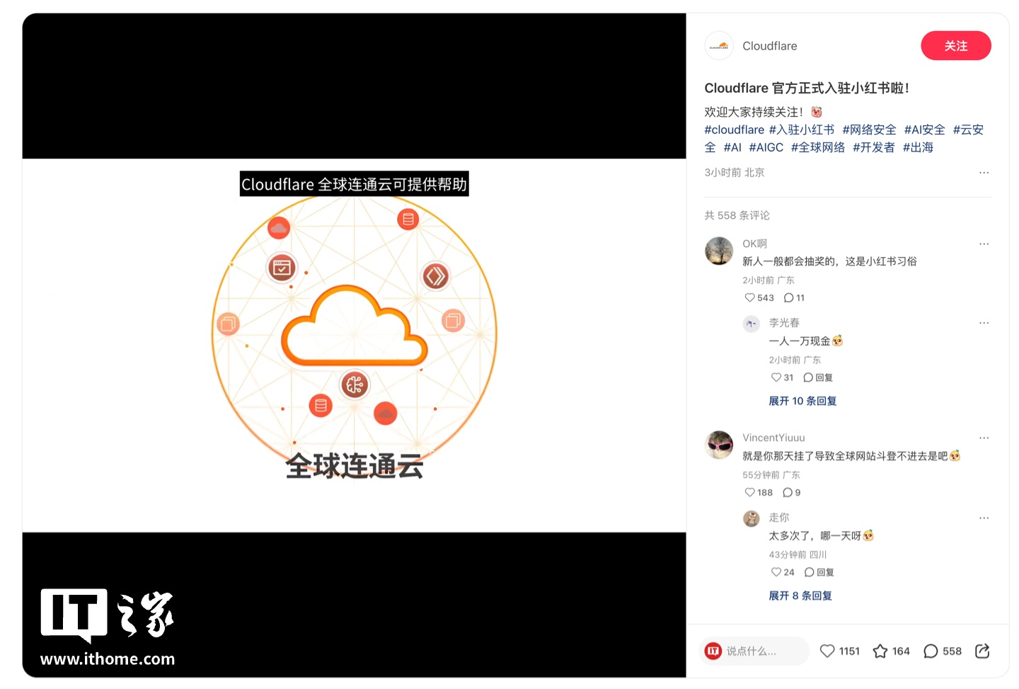 1 月 30 日消息,Cloudflare 宣布入驻B站和小红书,认证显示为“Cloudflare 中国官方账号”,视频页显示相应账号主要服务出海开发者,截至发稿,其中 B 站粉丝数量为 864 人,小红书粉丝为 2779 人。