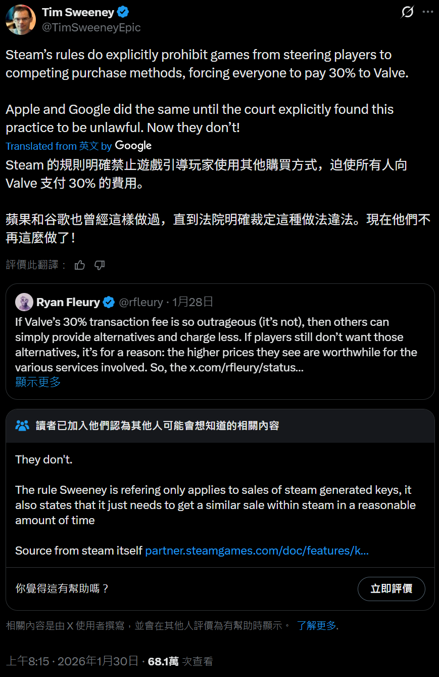 1 月 30 日消息,Epic Games CEO 蒂姆 · 斯威尼今天在 X 平台发文,公开批评 Steam 平台的支付规则,称这些规定禁止游戏引导玩家使用更具竞争力的其他支付方式。