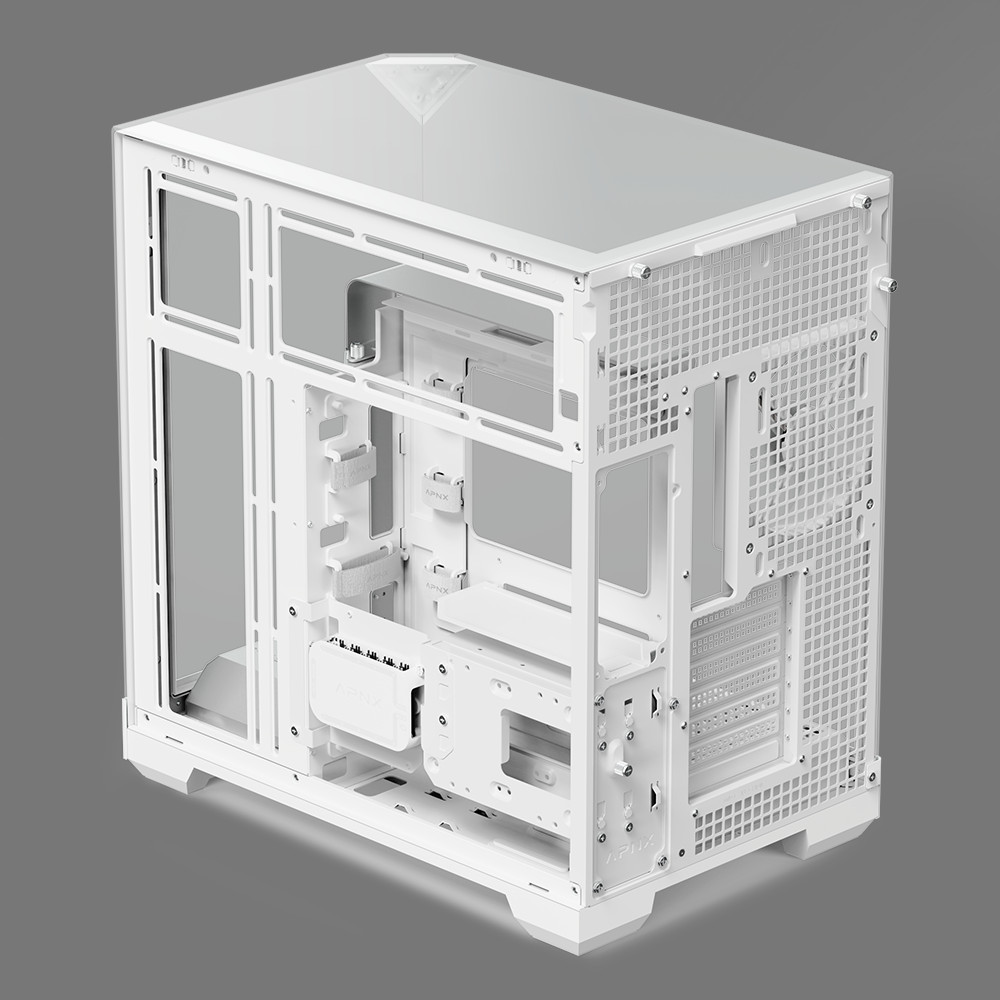 在第一眼看来,APNX V2 与一般机箱相比最大的差异可能是其相对独立的主板托盘,该托盘实现了机箱左右的软隔离,让显卡与电源的发热相互独立。此外这一设计意味着右侧板的上部可安装风扇,为散热提供了额外空间。