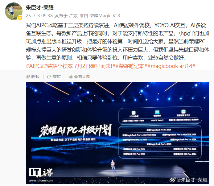 注意到,朱臣才在今年 7 月发文称,荣耀的 AIPC 战略基于三层架构持续演进,AI 使能硬件调校,YOYO AI 交互,AI 多设备互联生态。每款新产品上市的同时,对于能支持新特性的老产品,也加班加点推出版本推送升级。