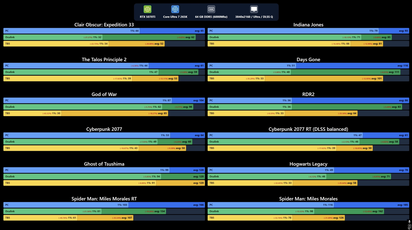 在使用英伟达 GeForce RTX 5070 Ti 进行的 12 款游戏测试中,通过雷电 5 连接的外置显卡,平均帧率表现始终落后于 OCuLink,平均比 OCuLink 低 13% 至 14%。