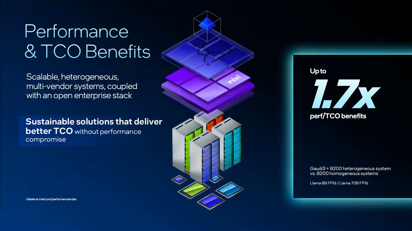 具体而言,在该平台上 B200 负责 AI 模型的预填充而解码部分则由 Gaudi3 负责,相较仅 B200 的同构解决方案在 Llama 开源模型上实现了至高 70% 的同 TCO 性能增益。