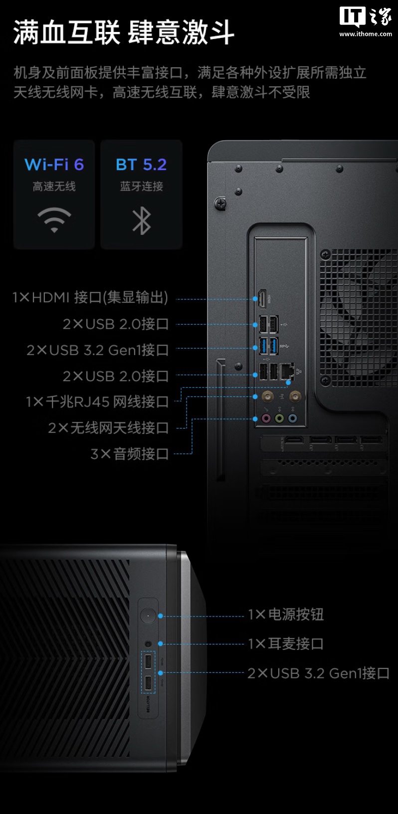 斗战者锋 7000 机箱采用黑化侧透设计,机身采用 0.8mm 厚度钢板,前脸中部为机甲风双尖外观,内部采用高效多分区飓风散热架构,整机解热能力约 700W。此外其搭载 500W 电源,支持 Wi-Fi 6 与蓝牙 5.2 无线连接并配有外置天线。