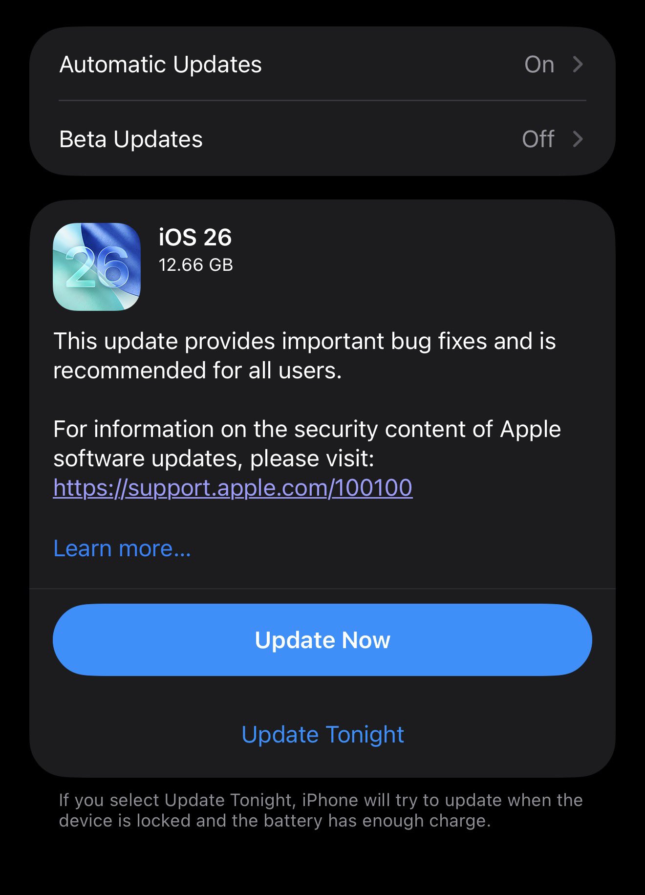 9 月 19 日消息,科技媒体 MacRumors 今天(9 月 19 日)发布博文,报道称苹果面向 iPhone 17 Pro 和 iPhone 17 Pro Max 推送了开箱后的首个 iOS 26 更新,内部版本号为 23A345。