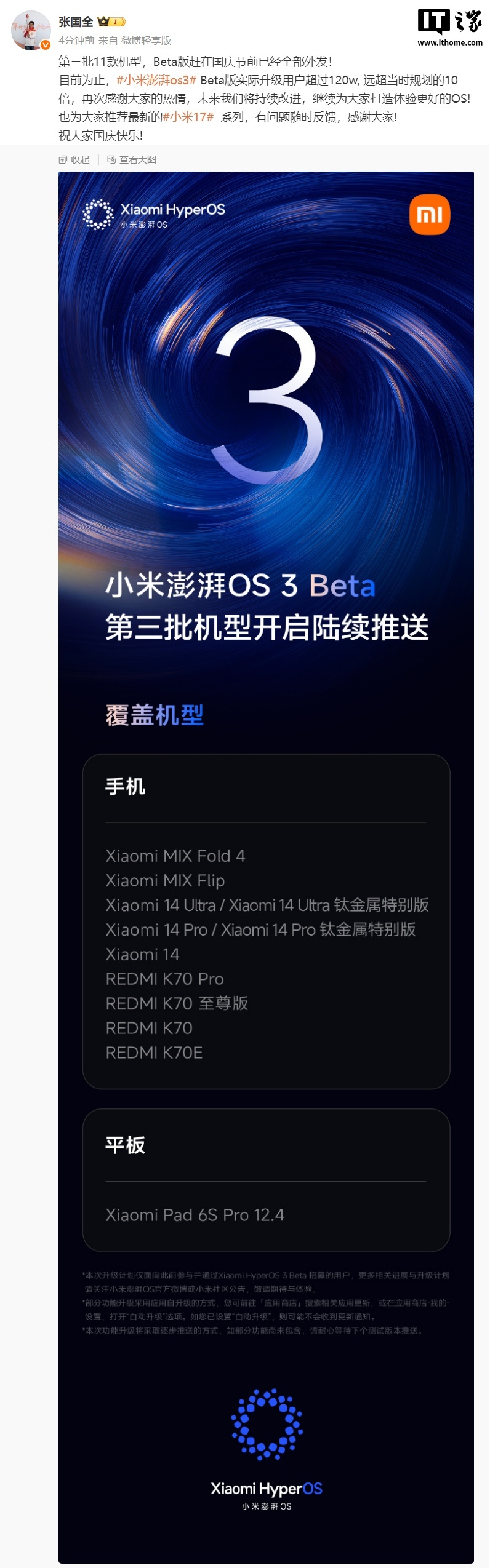 据此前报道,小米手机系统软件部总监张国全在 9 月 30 日发文称,小米澎湃 OS 3 Beta 第三批 11 款机型,Beta 版赶在国庆节前已经全部外发。张国全透露,小米澎湃 OS 3 Beta 版实际升级用户超过 120 万,远超当时规划的 10 倍。