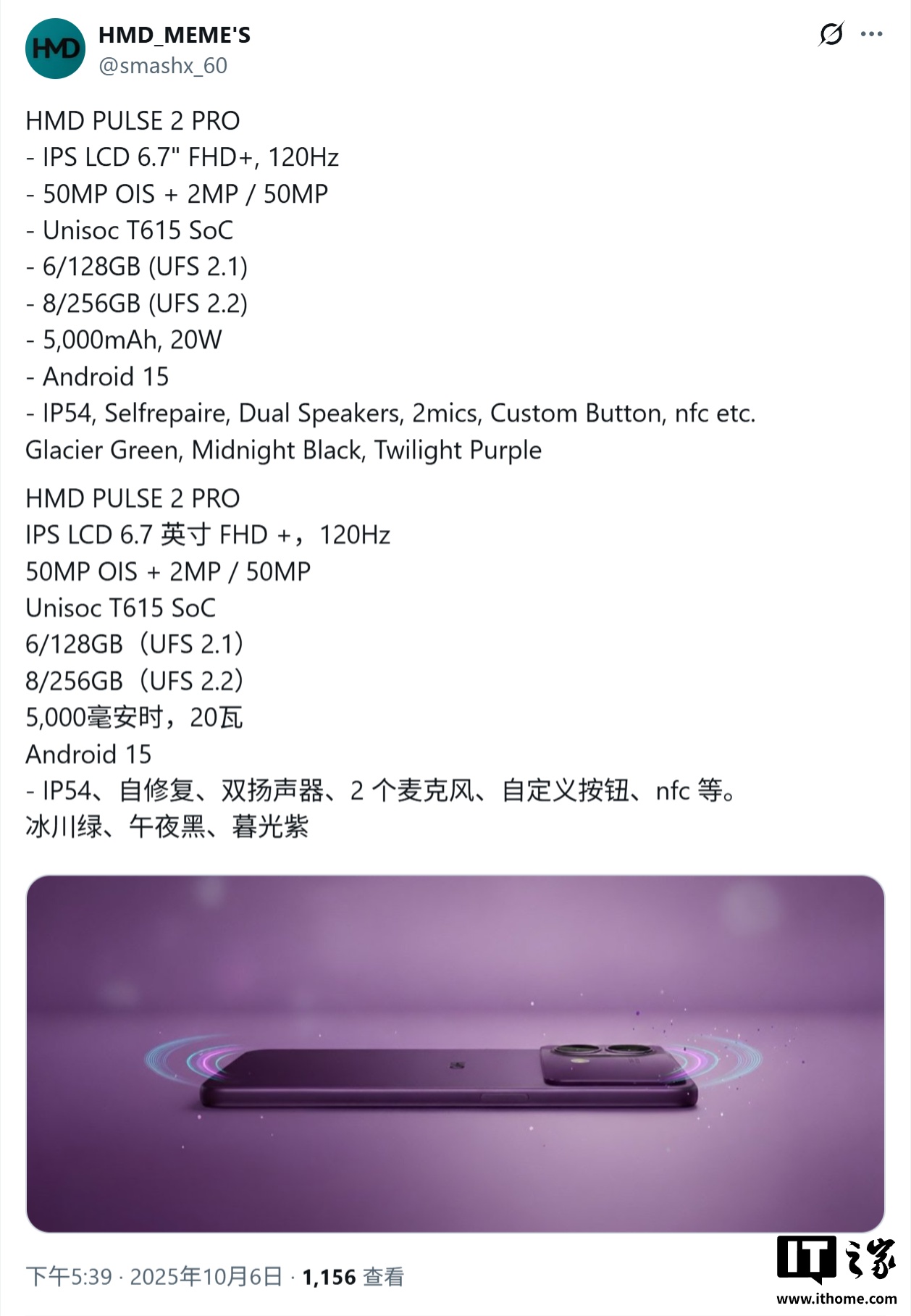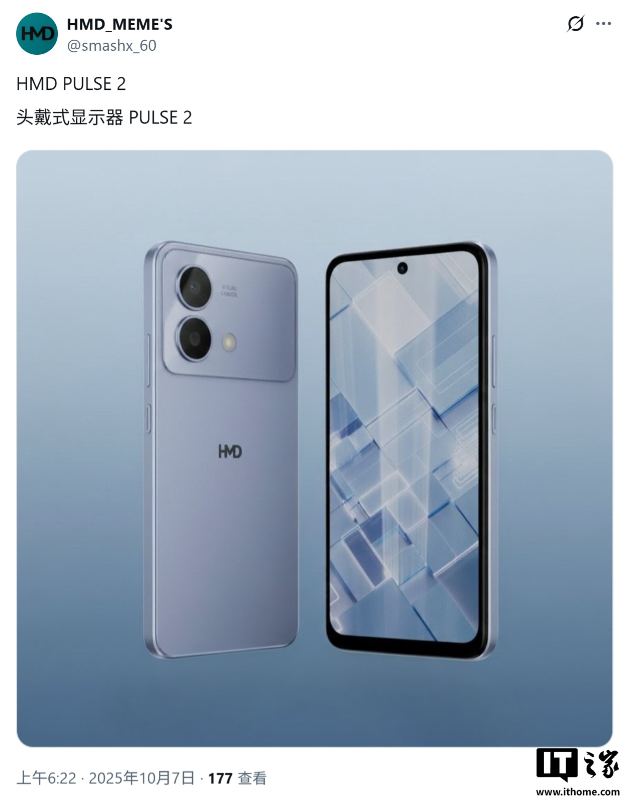 10 月 7 日消息,消息源 @smashx_60 今天(10 月 7 日)在 X 平台发布推文,曝料称 HMD Global 将推出 HMD Pulse 2、HMD Pulse 2+、HMD Pulse 2 Pro 三款机型,并分享了 HMD Pulse 2 Pro 机型的核心规格参数。