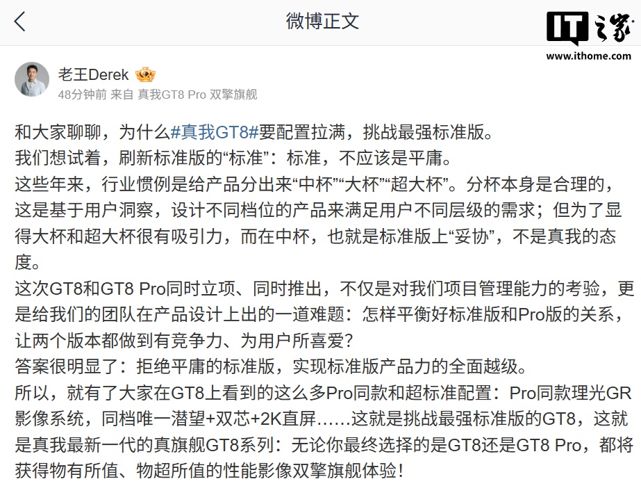 王伟认为,这次 GT8 和 GT8 Pro 同时立项、推出对他们的团队提出了一道难题:怎样平衡好标准版和 Pro 版的关系,让两个版本都有竞争力、为用户所喜爱。