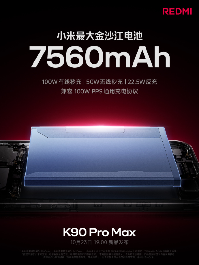 10 月 20 日消息,小米刚刚宣布,REDMI K90 Pro Max 搭载 7560mAh 小米最大金沙江电池,支持 100W 有线秒充 + 50W 无线秒充 + 22.5W 反充,全面兼容 100W PPS 通用充电协议。