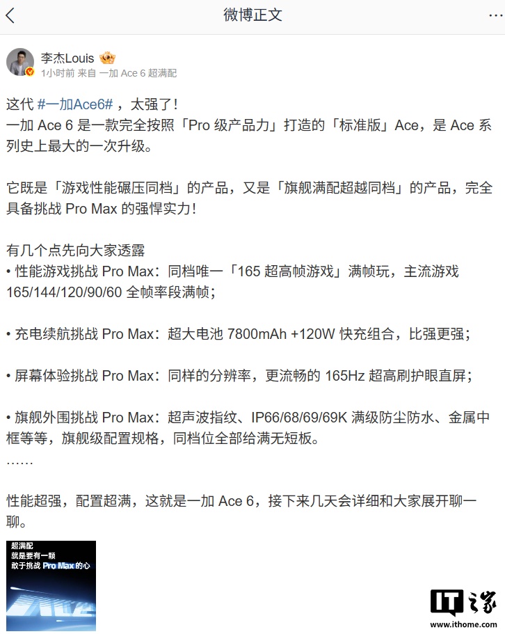10 月 20 日消息,一加中国区总裁 @李杰Louis 今日公布了一加 Ace 6 的部分规格,号称“Ace 系列史上最大的一次升级”,这款新机将于 10 月 27 日 19:00 发布。
