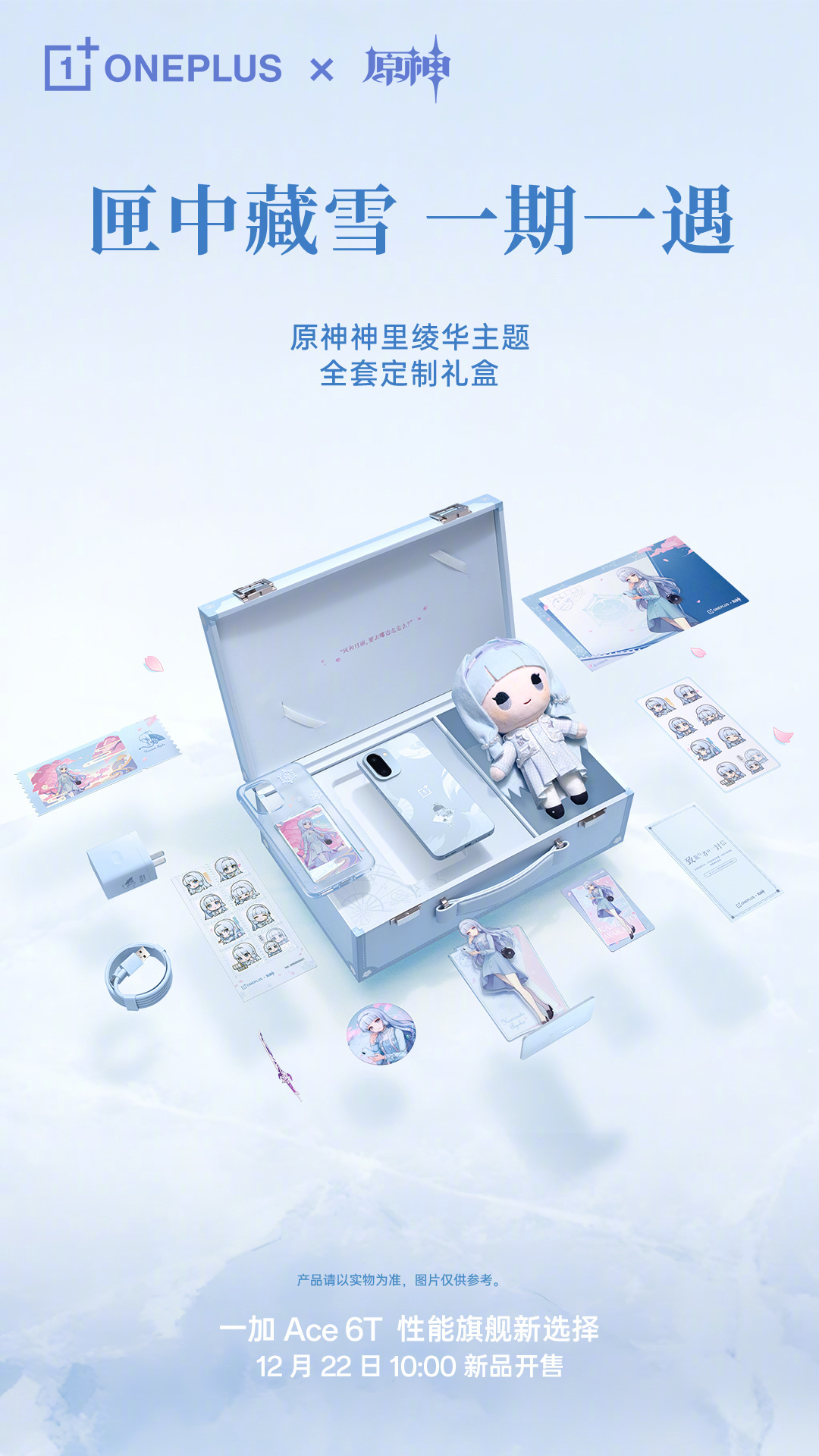 12 月 29 日消息,一加 Ace 6T 原神神里绫华定制机(16GB+512GB 规格)已于 12 月 22 日 10:00 开售,首销价 3699 元,赠定制手提箱礼盒。京东显示,该机将在今日 10:00 再次开售。