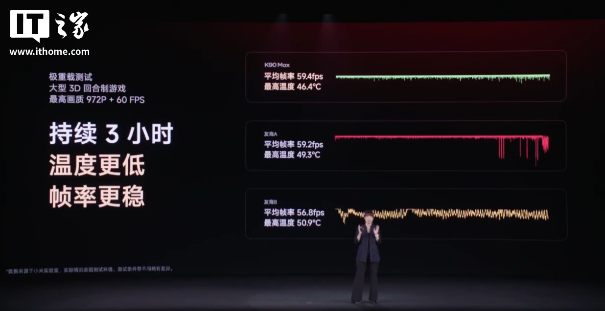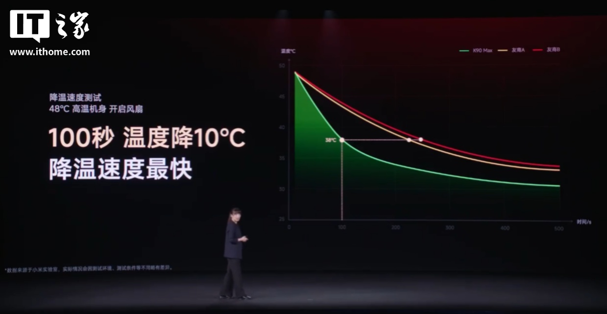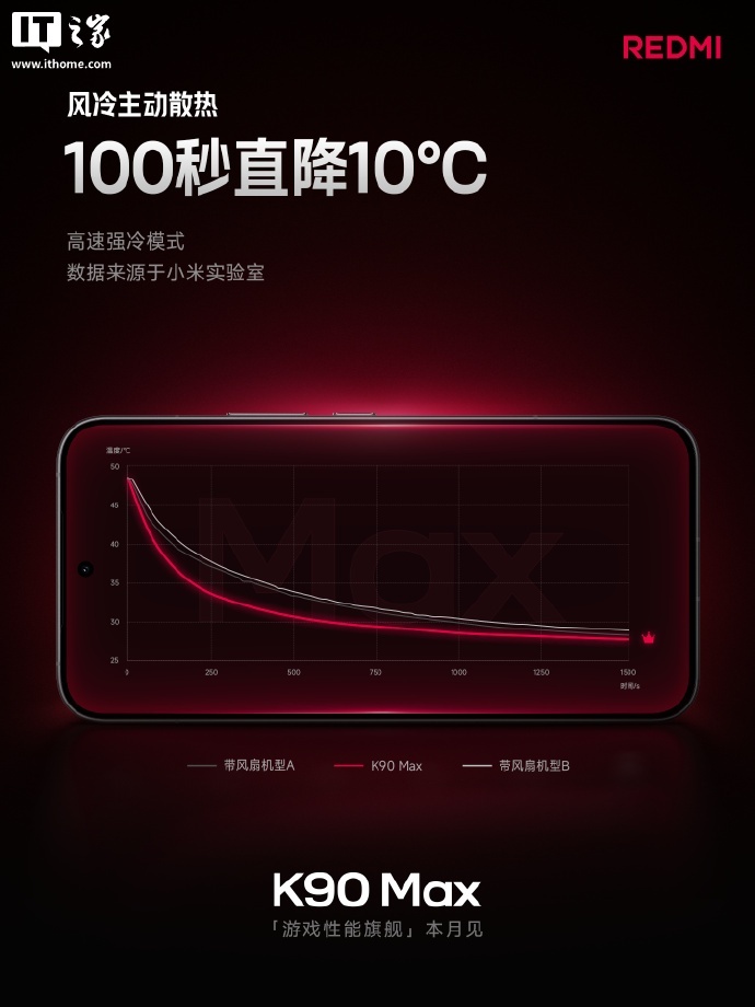 根据小米官方晒出的测试数据,REDMI K90 Max 支持 100 秒降温 10 ℃,降温速度相比友商的两款机型更快;游戏测试也能够稳帧更持久。