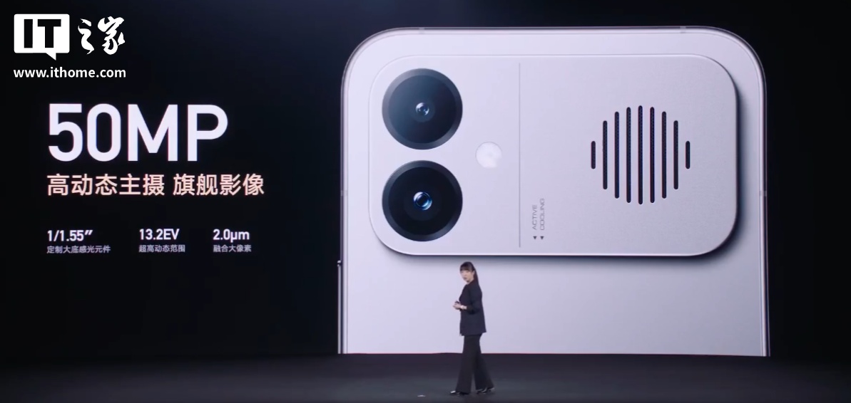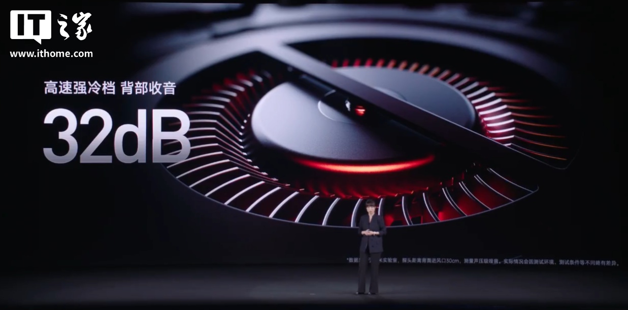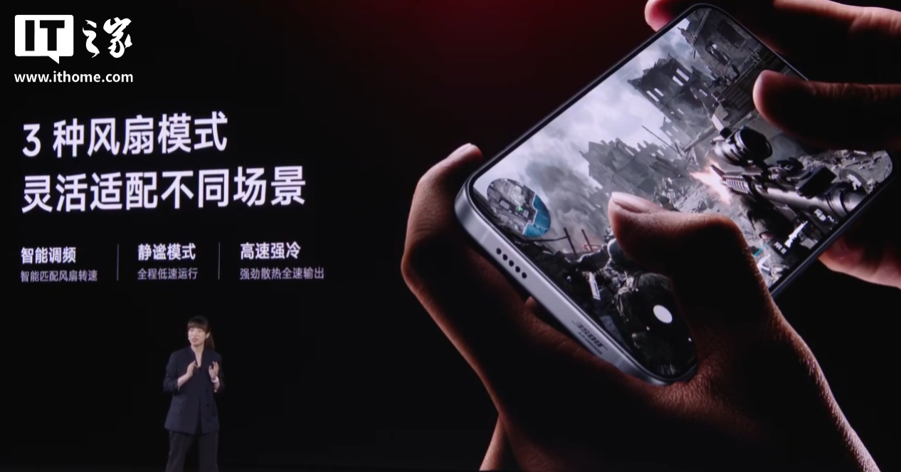 据介绍,这款手机搭载 18.1mm 大尺寸风扇,直径超主流方案 6%,拥有直立式进风设计,前倾扇叶增压聚风。每分钟风量可达 0.42CFM,是友商的 1.3 倍。在高速强冷模式下,100 秒直降 10℃。