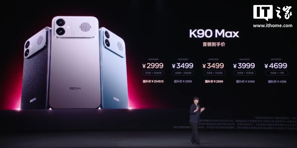 4 月 21 日消息,小米 REDMI K90 Max 手机今晚正式发布,售价 3499 元起,首销期全版本补贴 300 元,首销价 2999 元起,国补价 2549.15 元起。