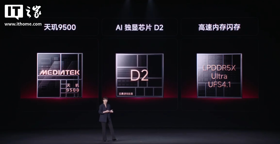 REDMI K90 Max 搭载联发科天玑 9500 处理器,还有 AI 独显芯片 D2、LPDDR5X Ultra 内存、UFS 4.1 闪存,支持百款游戏的 1.5K + 165Hz 并发。