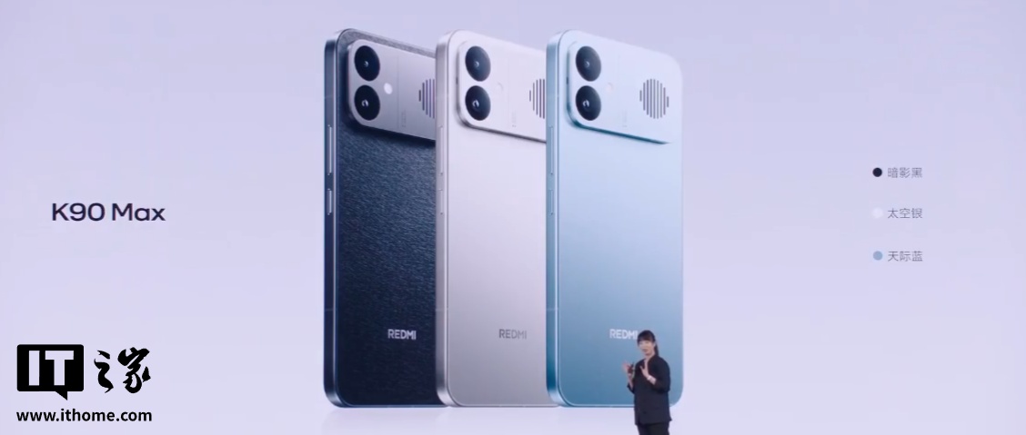 REDMI K90 Max 可选“太空银”“暗影黑”“天际蓝”配色,采用铝合金中框、极窄边设计、极简格栅开孔。