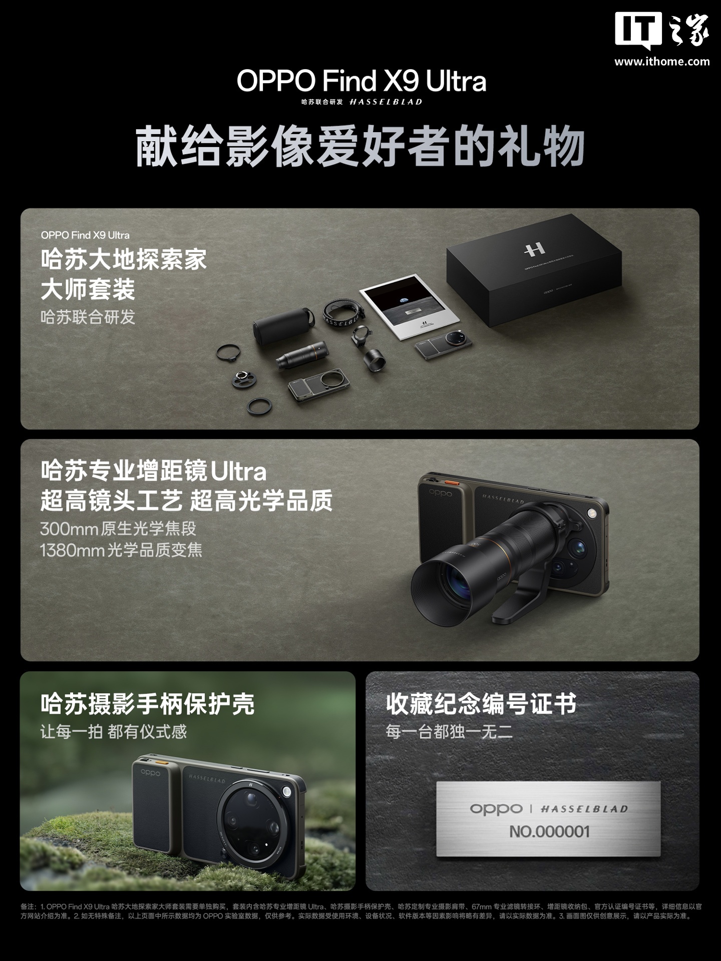 OPPO 还推出了哈苏大地探索家大师套装,套装内包含哈苏专业增距镜 Ultra、哈苏摄影手柄保护壳、哈苏定制专业摄影肩带、67mm 专业滤镜转接环、增距镜收纳包、官方认证编号证书等,每一套都独一无二。
