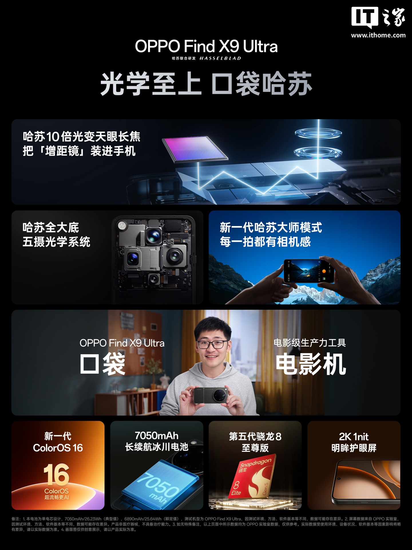 4 月 21 日消息,在今晚的 OPPO × 哈苏影像新品发布会上,OPPO Find X9 Ultra 旗舰手机正式发布。新机搭载第五代骁龙 8 至尊版处理器、内置 7050mAh 冰川电池,主打“光学至上,口袋哈苏”,定价 7499 元起。