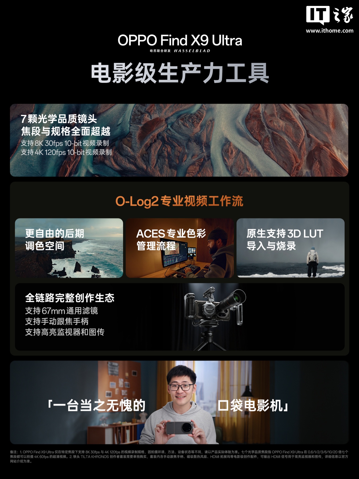 OPPO Find X9 Ultra 还号称“视频创作者的电影级生产力工具”,全大底专业视频镜头组,7 颗光学品质镜头,支持 8K 30fps 10-bit Log 和 4K 120fps 10-bit Log 电影级录制规格。