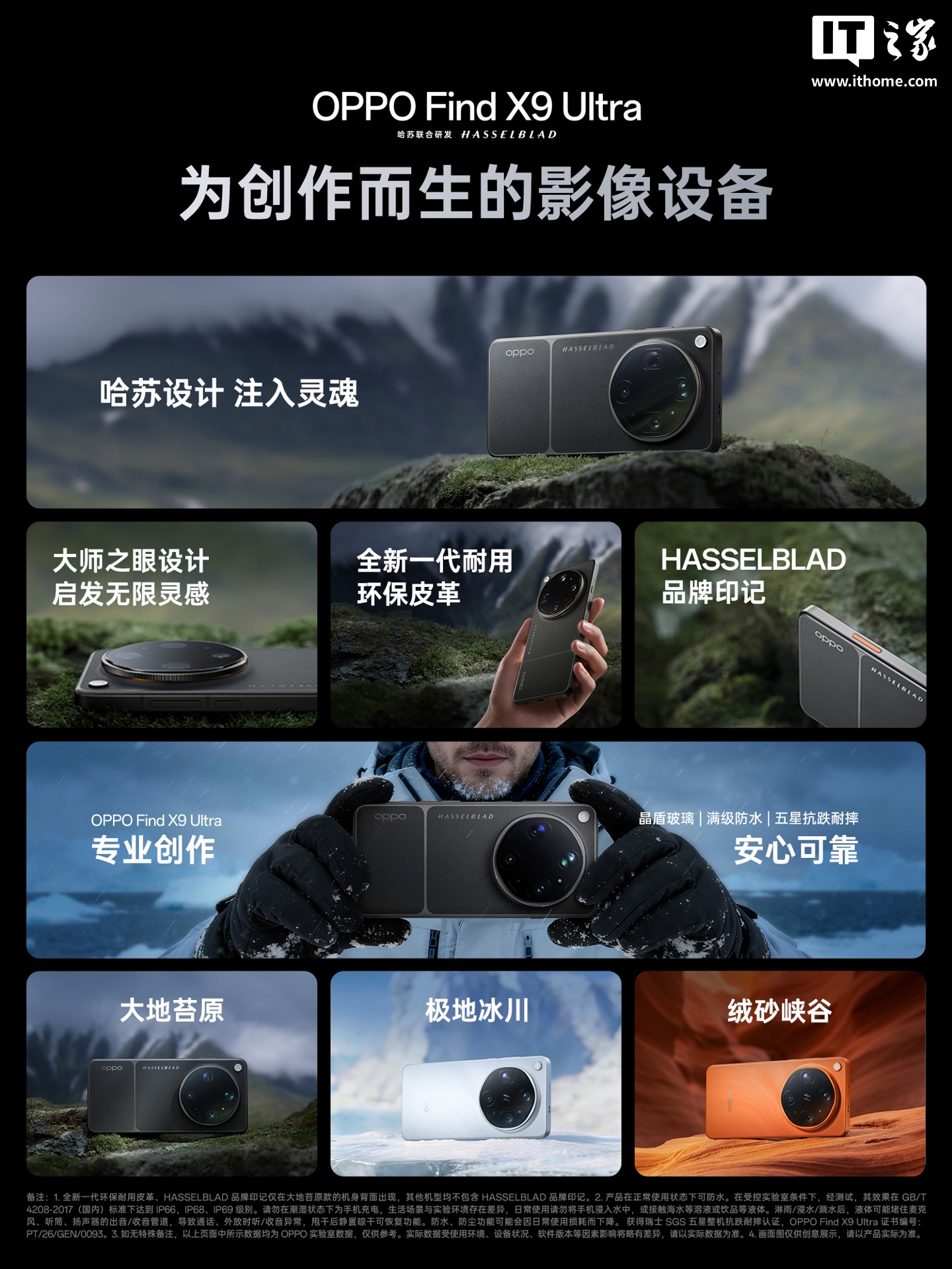 据介绍,全新 OPPO Find X9 Ultra 手机宣称是为创作而生的影像设备,灵感来自哈苏 X2D 100C 大地探索家限量版,机身采用新一代耐用环保皮革,并拥有哈苏品牌横标。