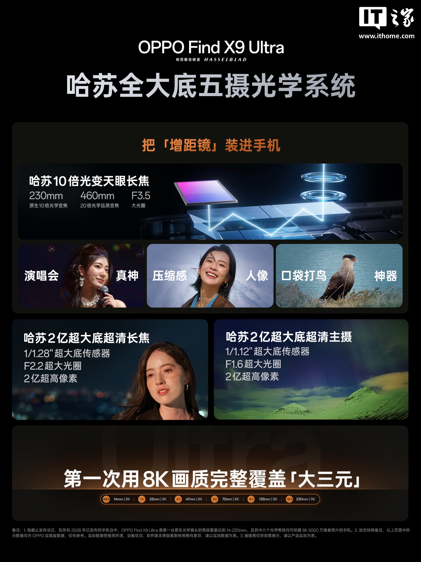 OPPO Find X9 Ultra 六颗镜头全面升级:哈苏 10 倍光变天眼长焦,拥有 10 倍原生光学变焦,更支持 20 倍光学品质变焦,适用于演唱会、压缩感人像、口袋打鸟场景;哈苏 2 亿超大底超清长焦,感光能力和动态范围都全面升级;哈苏 2 亿超大底超清主摄,进光量和像素数量全面提升。