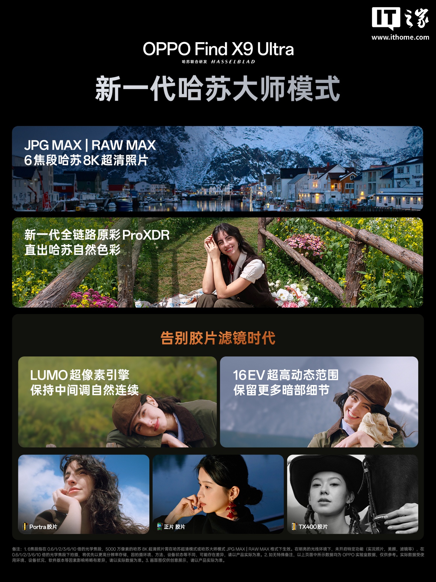 注意到,OPPO Find X9 Ultra 还支持新一代哈苏大师模式,提供哈苏真实细节、哈苏自然色彩、大师模式原生胶片三大功能: