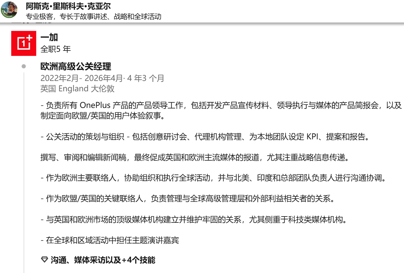 并且,曾在一加工作近十年的英国、西班牙经理 Serban Chiscop 也离开公司。虽然他们的离职声明语气相对积极,但实际情况可能更复杂。一位要求匿名的员工表示:“正如你所看到的,上周几乎整个欧盟团队都离开了公司”。
